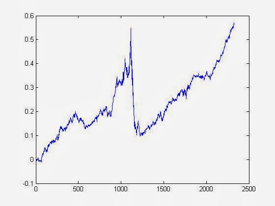 Обратите внимание на резкую просадку с 30.05.2008 по 04.11.2008 и почти идеальное восстановление с тех пор. Это отражает поведение самого рынка ценных бумаг, и возникает вопрос о том, зачем мы вообще формировали лонг/шорт портфель, раз это не хеджирует против падения рынка. Интересно также то, что этот фактор не обнаруживает «импульсный крах», описанный в одной из статей: он вообще не допускает такого во время восстановления рынка. Это означает, что мы не должны автоматически думать о фундаментальном факторе роста, как об аналогии ценовому импульсу.